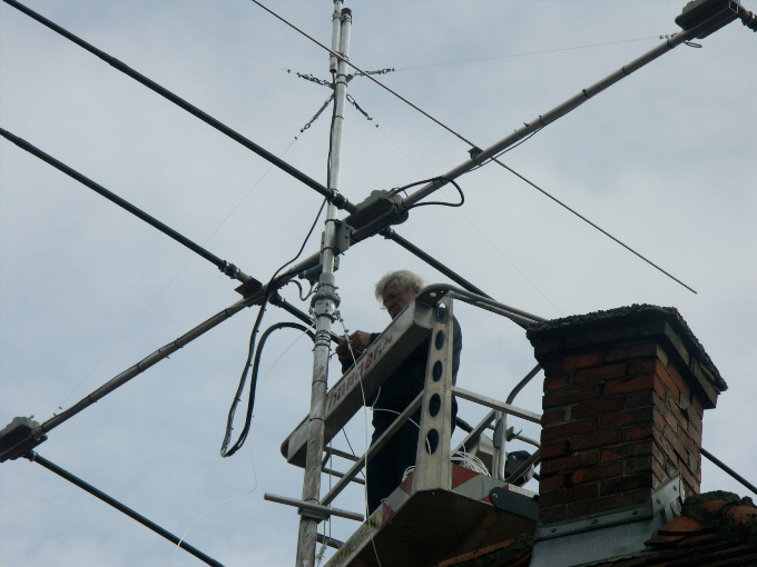 Zur gleichen Zeit hatte mein ATV-QSO-Partner Harald, DB3MA aus Augsburg, der die Antenne seit mehreren Jahren in Betrieb hat, ebenfalls über Probleme geklagt die irgendwann darin gipfelten, dass seine Antenne unverhersagbares SWR hatte und irgendwann komplett den Dienst versagte. Da der Antennaufbau auf meinem Haus nicht grade unkompliziert ist und immer der Einsatz einer 30m-Hebebühne notwendig ist habe ich mich dazu entschlossen, Haralds Antenne und meine neue, noch nicht aufgebaute Antenne gleichzeitig auf einen verbesserten Stand zu bringen bevor sie auf das Dach kommt......