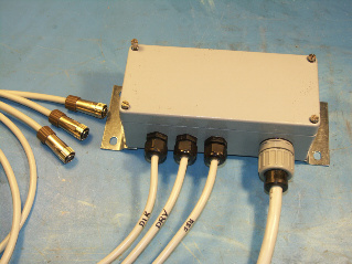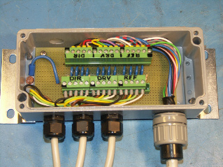 So sieht dann meine "Lösung" der Schrittmotor Anschlüsse aus: Ein wasserdichtes Kästchen mit Skintop - Verschraubungen und zuverlässigen Steckverbindern zusammen mit Überspannungs- ableitern an der Antenne.