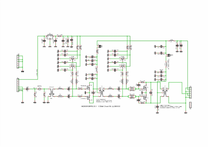 The power supply is 12..13.8 Volt DC, max. 2.5 Amps. In both push-pull stages, modern RF field-effect transitors from Hitachi are used, in the driver stage 2 x RD01MUS2 and for the second stage